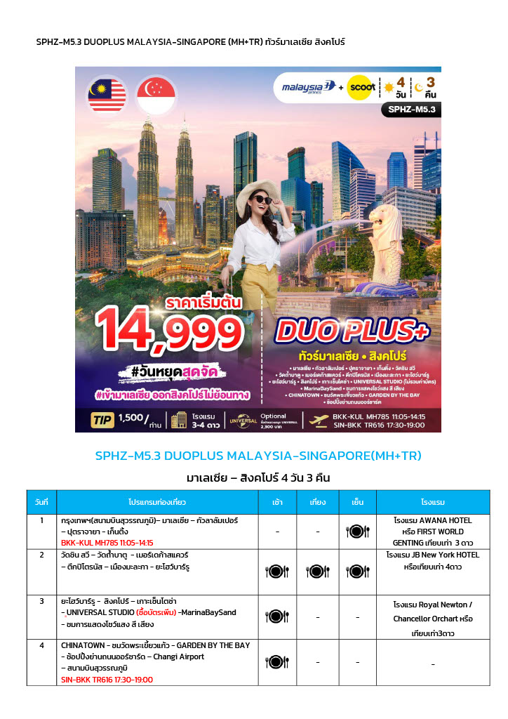 | SPHZ-M5.3 DUOPLUS MALAYSIA SINGAPORE 4D3N (MH+TR) OCT 25 - APR 26 เข้ากัวลา-ออกสิงคโปร์ |