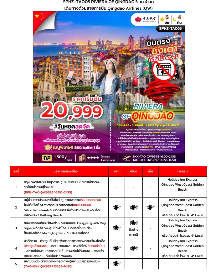 ทัวร์ชิงเต่า • ยุโรปฟีลจีน • เมือง Cyberpunk ริมทะเล · หมู่บ้านชาวประมงฮวงซั่วโจว · ถุงหายาชาย (รวมรถกู๋ทุกนา) · โบสถ์คริสต์ St. Michael’s Cathedral (ชมภายนอก) · Silverfish street · ถนนวัฒนธรรมเยว่ไปก่า · สะพานจงเซี่ยง · No.3 Bathing Beach · พิพิธภัณฑ์ประวัติศาสตร์ · ถนนคนเดิน Longjiang · 4th May Square ตรู่สี่ 54 · ศูนย์การค้าโอเชี่ยนก้านไน้ฮ่าวไถ้ · ช้อปปิ้งที่ห้าง MixC Qingdao · แหล่งช้อปปิ้งไห่โก่ว · ป่าต้าซาน · ถ่ายรูปกับบ้านพักตากอากาศท่าเรือปีศาจ (ถ่ายรูปด้านนอก) · หาดหมายเลข 2 · กระเช้าไฟฟ้า (รอบค่ำขึ้น) · สถานที่จัดงานเทศกาลเบียร์ · ทางเข้าเสียเปี้ยนหมา · ศาลเจ้ามหาพุทธเจ้า · แหล่งช็อปปิ้ง Wanda Day 1: กรุงเทพฯ(สนามบินสุวรรณภูมิ)–สนามบินชิงเต่าเชิงเต่าว–รถโค้ชนำท่านสู่โรงแรม )(BKK–TAO QW9898 16:00–21:35)